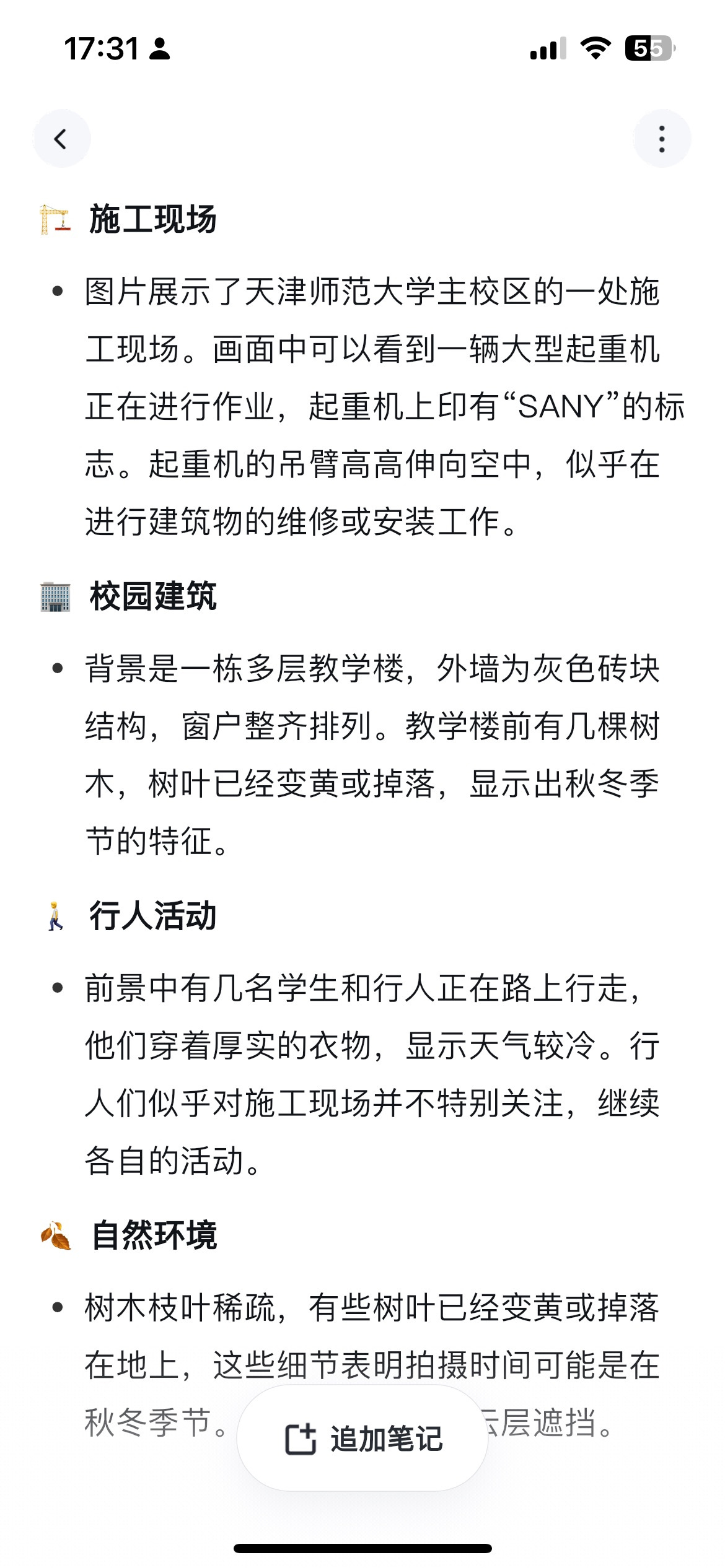 Get 笔记不光认出了准确的地点,还把起重机品牌、楼宇特点、季节等信息全还原了。
