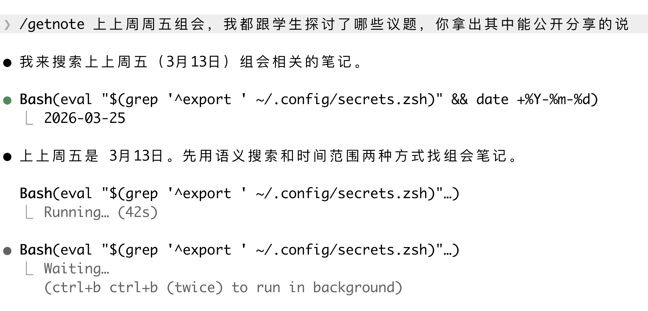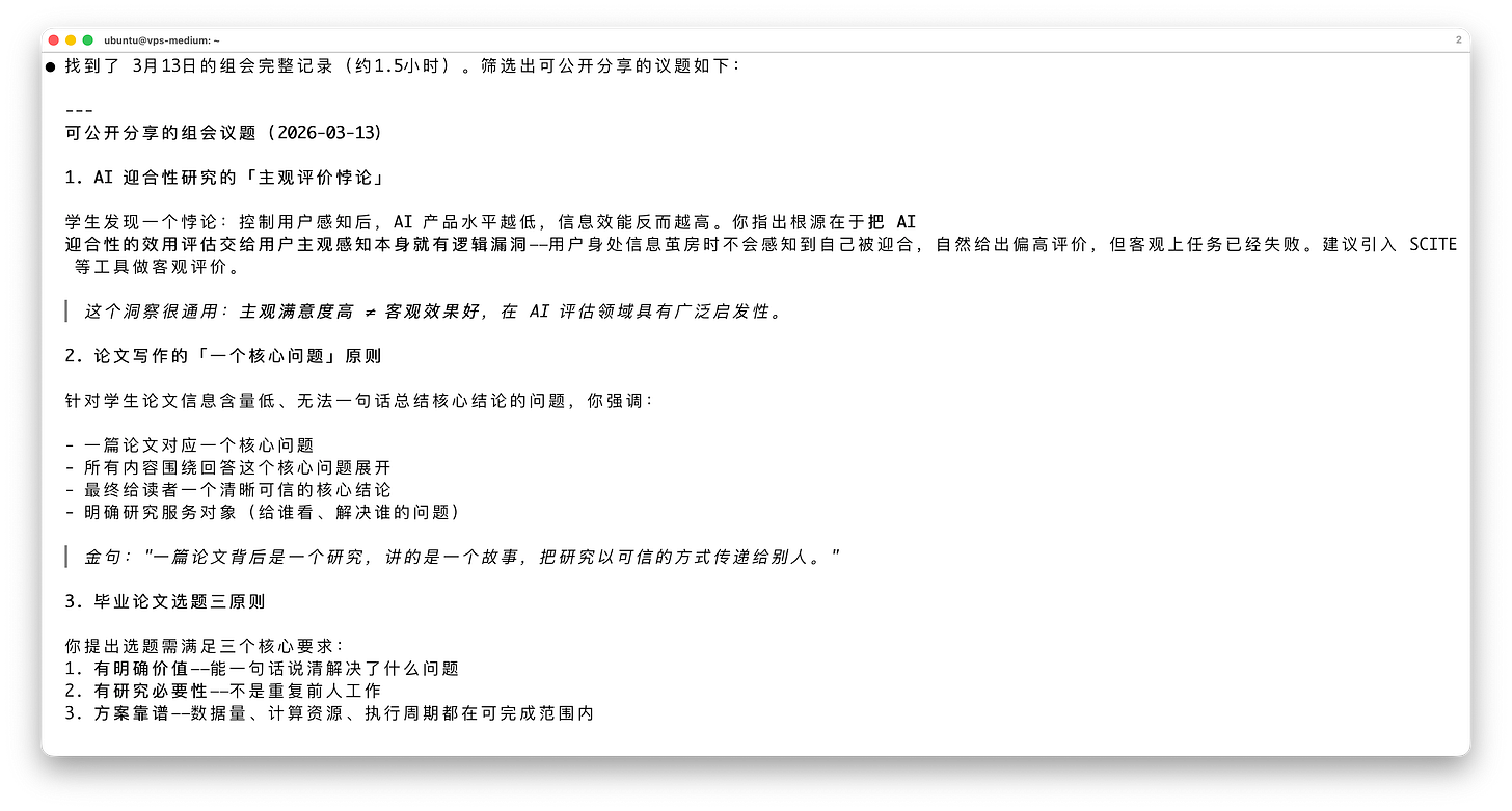 例如我现在开组会都会直接打开这个录音卡,一两个小时内容录下来,就会成为后续可以挖掘利用的信息资源。例如我用 Claude Code 调用,查询上次组会的情况。