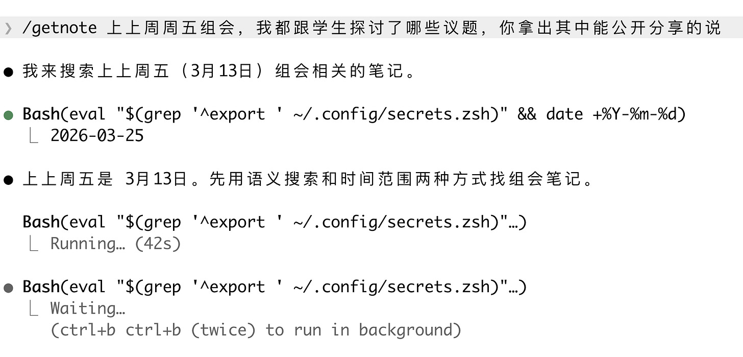 我 3 月 17 日把 Get 笔记的 Skill 接进 Claude Code 之后,第一件事就是问了一句:「过去 10 天我都关注了哪些问题?」各种记录 —— 包括录音卡的 —— 全都涌了出来。