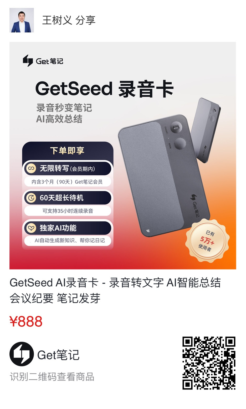 例如,原本 Get 笔记就可以直接在手机上语音输入,而且整理成文字的效果很好。现在,它支持了硬件,也就是 GetSeed 录音卡 。
