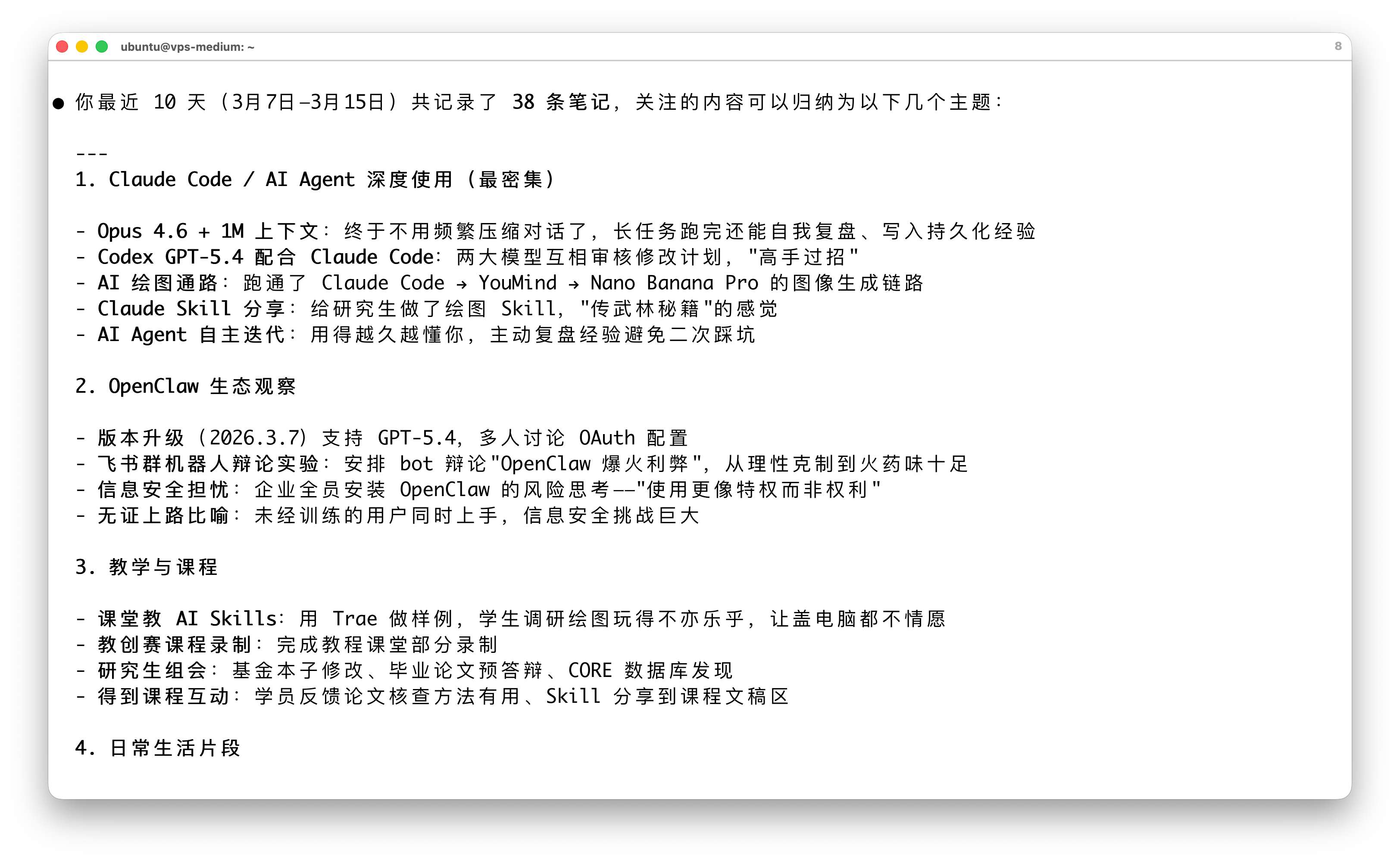 这里大部分的记录我都同意,只是日记中说我今天只工作了 10 分钟,我是不认的。这只是我跟它直接语音输入对话,以及 Claude Code 调用它来做一些经验记录的时间长度总和。