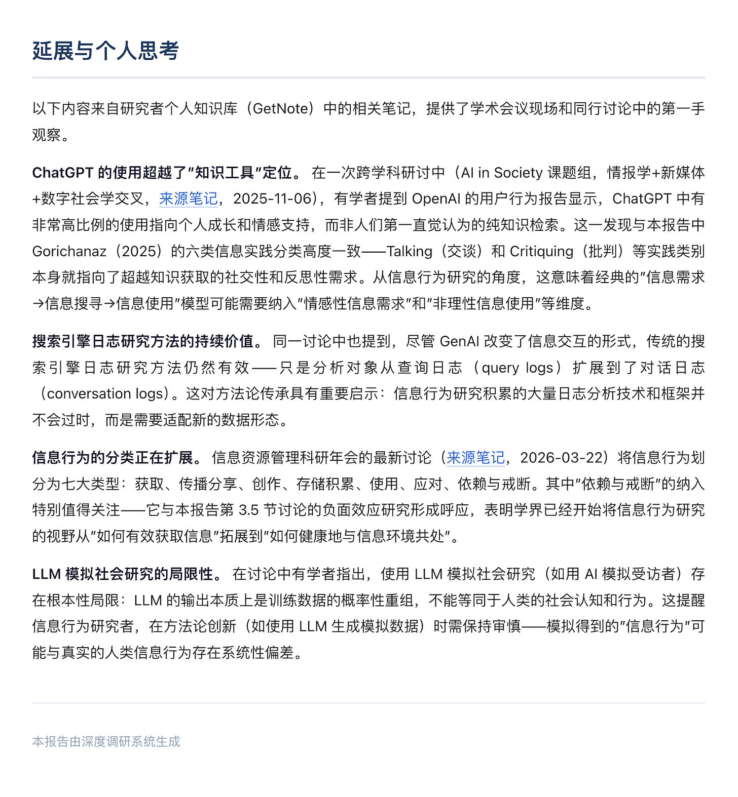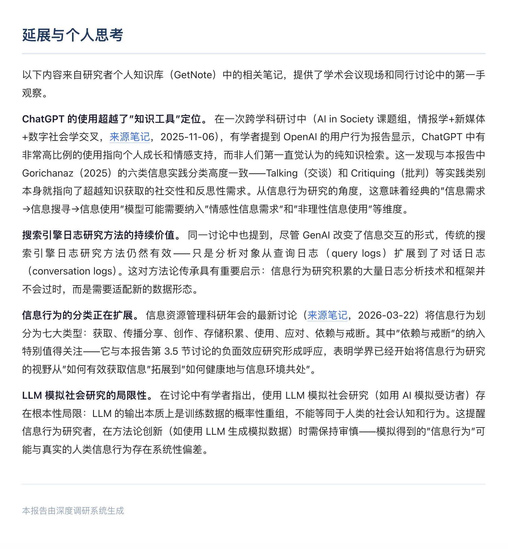 我有意识地主动把 Get 笔记接进了调研流程。外部信息查找完毕后,我的要求多了一步:把调研结果和我在 Get 笔记里已有的记录关联起来。报告结尾会专门列一个篇章,告诉我这次的主题和哪些旧笔记相关,可以直接跳转。