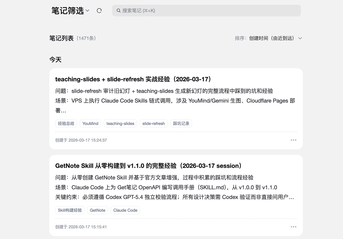 后来我做了一件事:要求每次 Claude Code 对话结束时,把值得留下的经验自动存进 Get 笔记。该记到配置里的记配置,该改 Skill 的改 Skill,总体的经验则原原本本存到 Get 笔记。