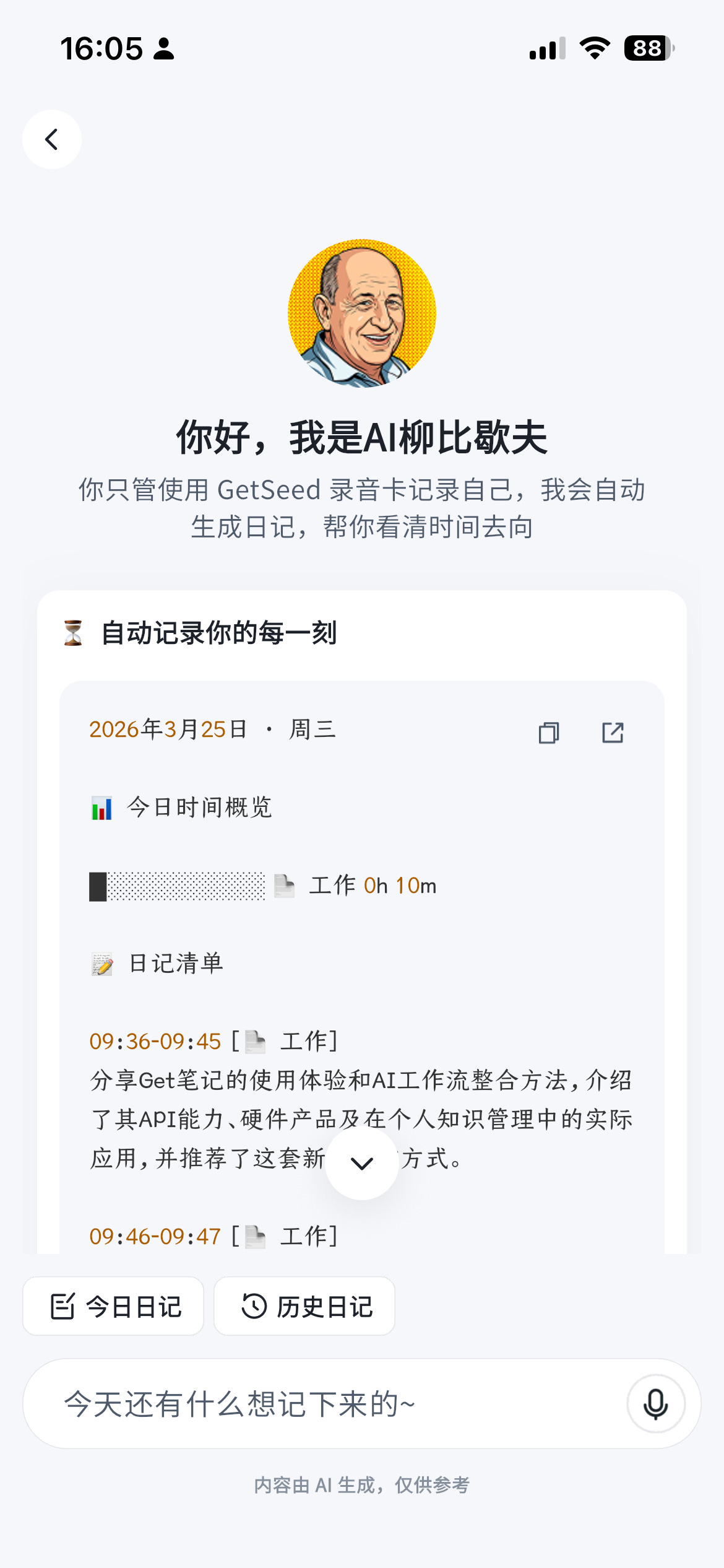 录音卡还有一个特色功能叫「AI 柳比歇夫记日记」。你每天只管往里录,Get 笔记自动整理你这一天究竟在做什么。原来会议记录、临时感悟和当天日记要分开记,现在它自己帮你融于一炉。