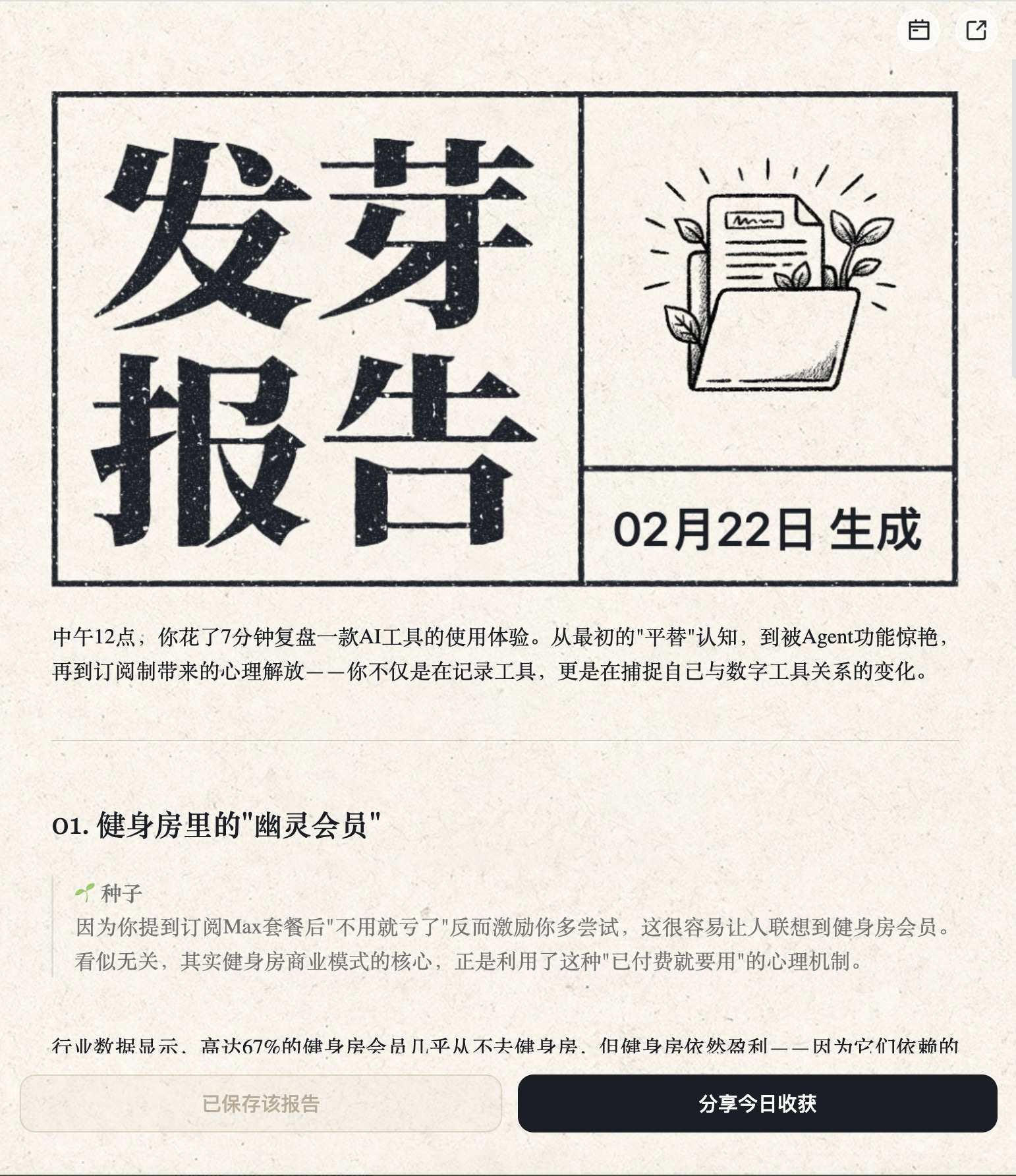 有一回我随口录了一段感悟,回顾自己订阅 Youmind Max 会员的事儿。结果点击一下「发芽」,这次录音就变成一份精美的发芽报告。