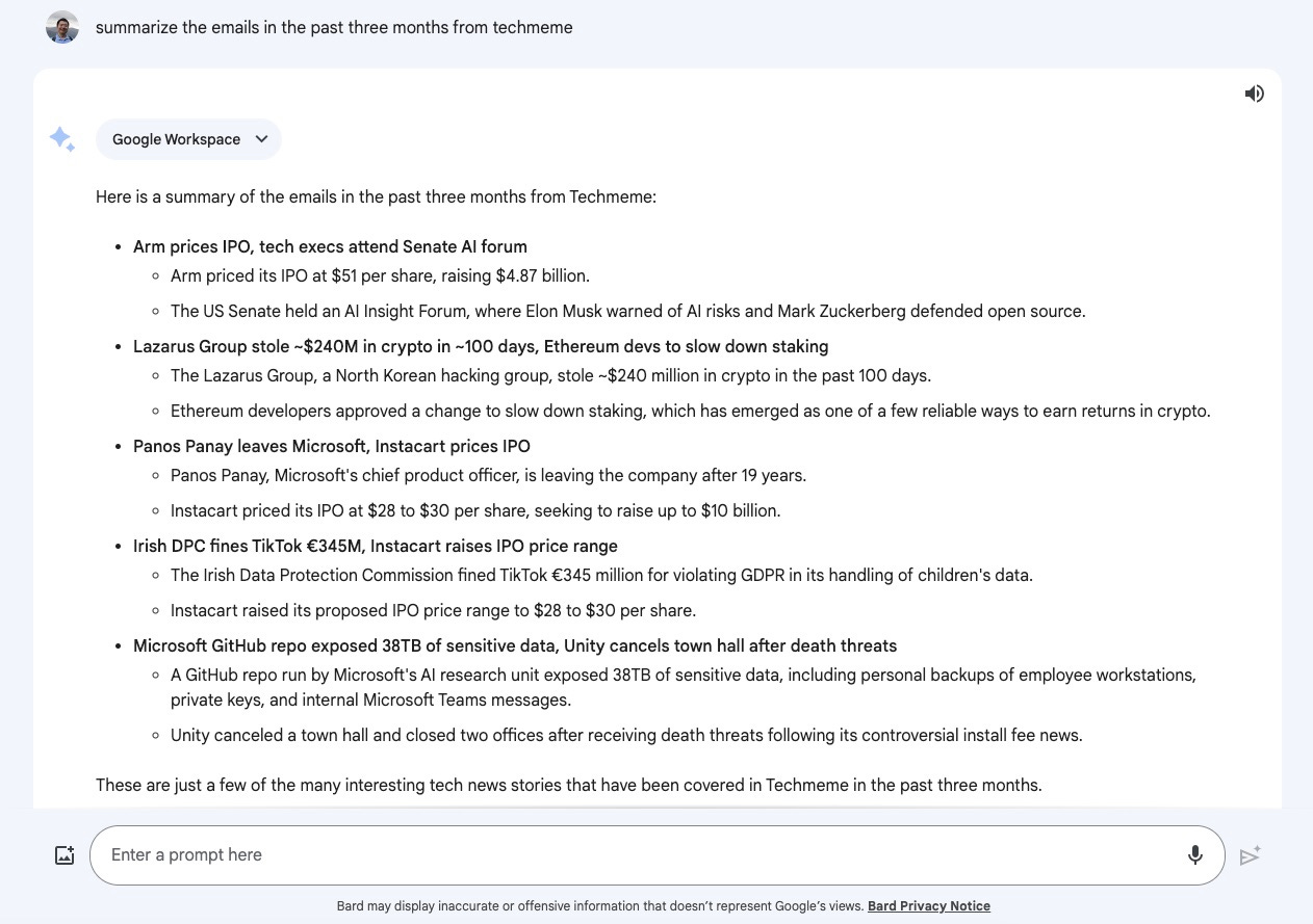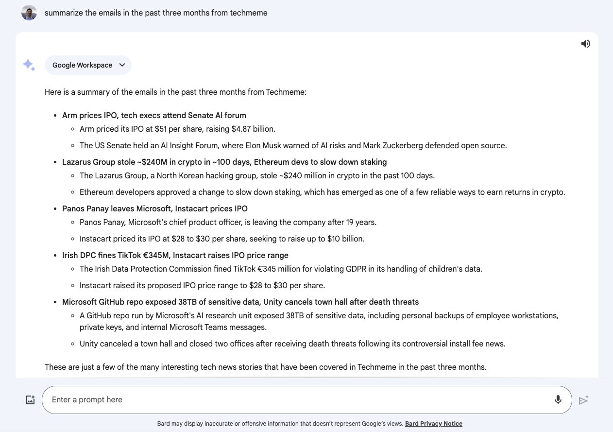 但是现在,因为 Bard 可以连接 Gmail 进行操作,事情就变得简单了。这是我让 Bard 帮我总结最近 3 个月 Techmeme 的邮件都在说啥。