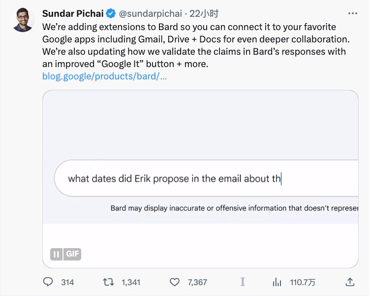 而这次 Bard 更新,显然连 CEO Pichai 先生都很兴奋。