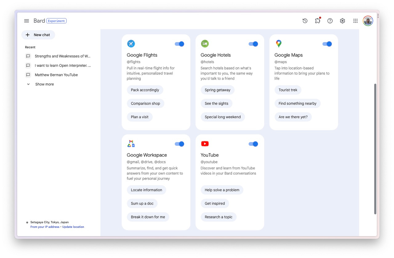此次 Bard 更新了不少内容,具体你可以参看这里。我今天主要想跟你聊的,是 Bard 终于有了插件系统。而且,首批插件都是 Google 自家服务。