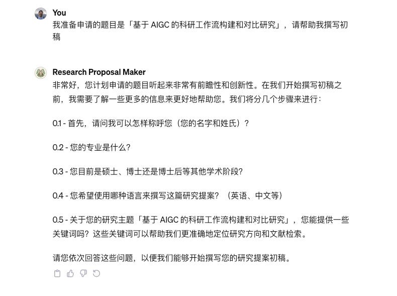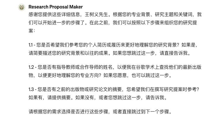 最近,在 尝试使用 GPTs 撰写学术基金申请书时,我意识到了一个问题。这个工具并不是让我们快速完成稿件,而是将过程分解为多个步骤,每一步都不急不缓,通过对话收集大量信息。
