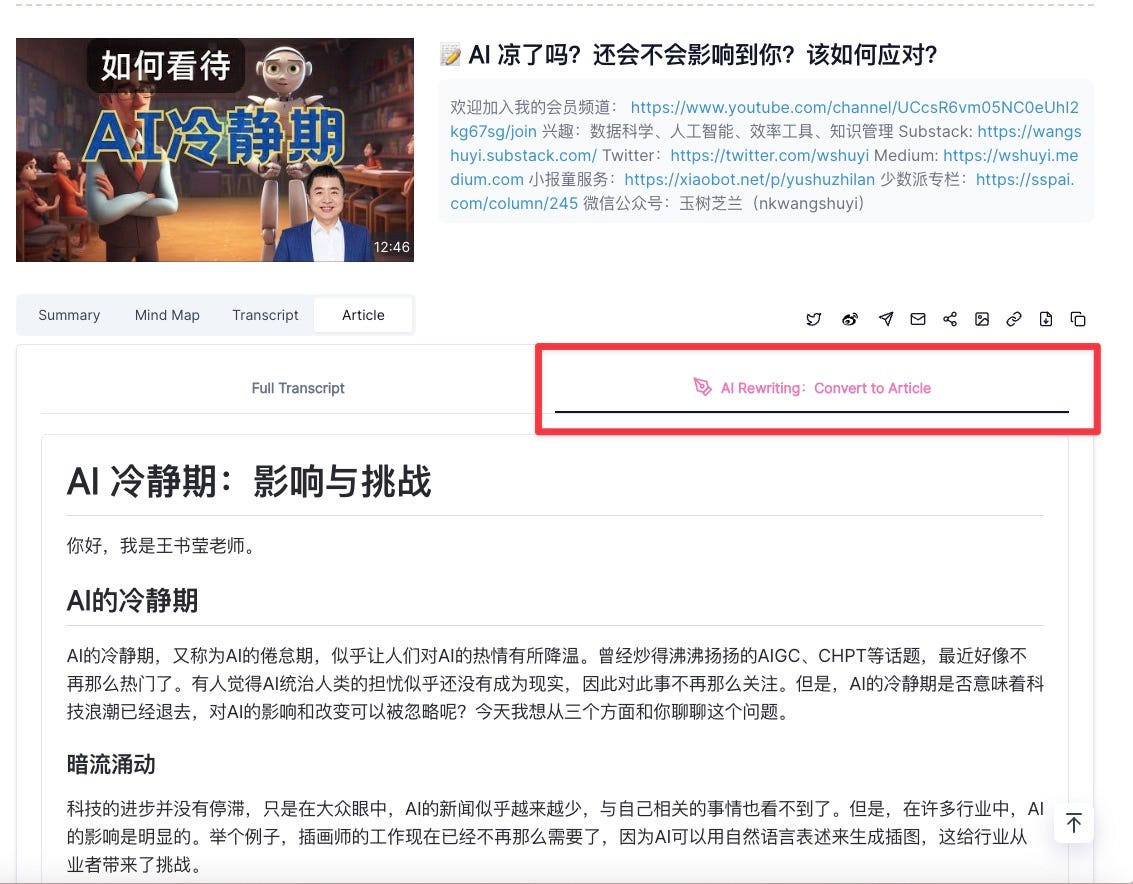我提出的需求是,让 BibiGPT 帮助我们将视频中的音频内容直接转写成文章。有了这个功能,我们就可以在转写的基础上进行简单修改和润色,最终完成文章的创作。吕立青对此也很兴奋,很快就开发出了这一功能。此外,我已经多次利用这一功能完成了相关工作。