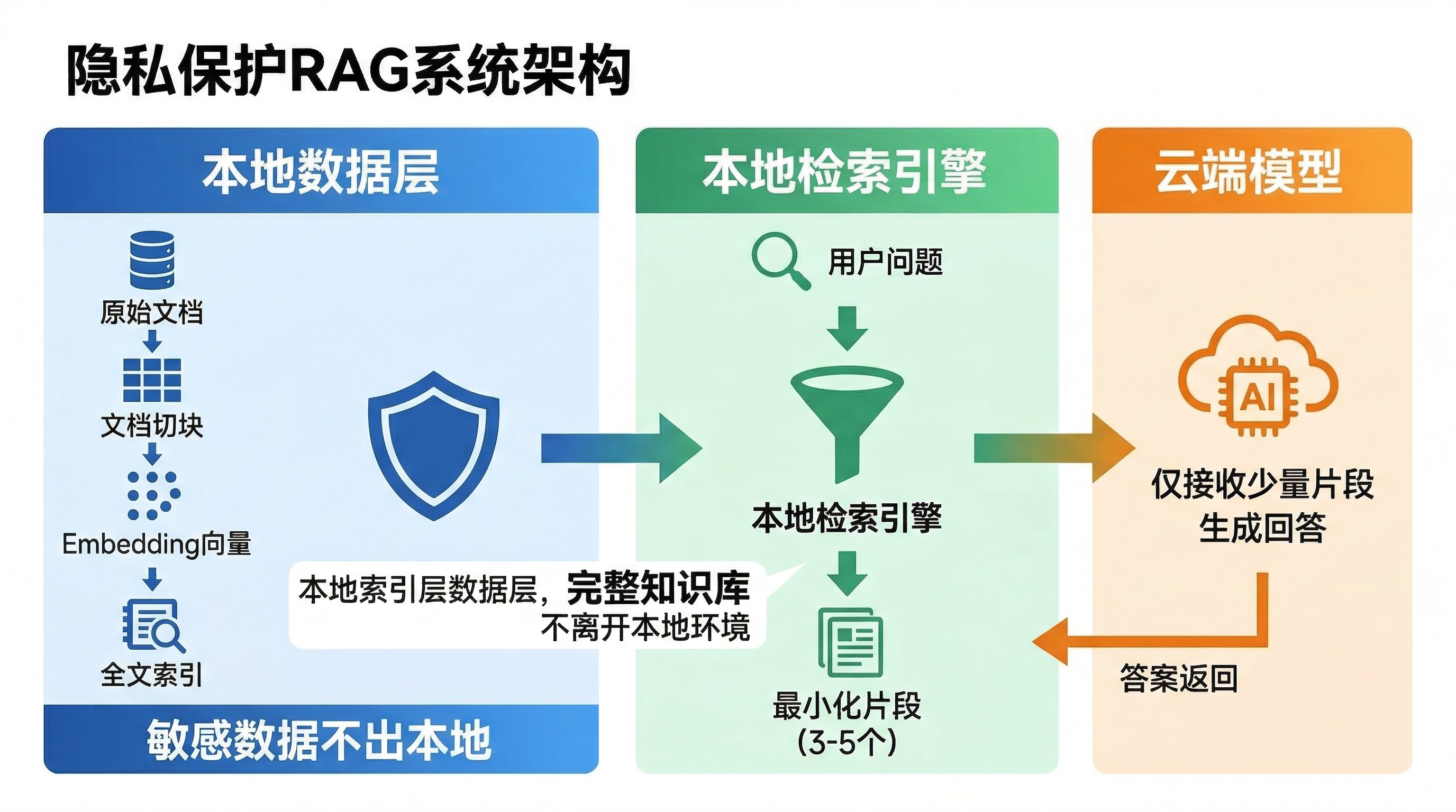 那怎么画这条保密边界?关键是把敏感数据挡在检索层。 你的原始文档、切块、embedding、全文索引——这些全部留在本地。云端模型只看到经过检索筛选后的最小化结果。这样即使模型在云端,它接触到的也只是和当前问题相关的几个片段,不是你的完整知识库。
