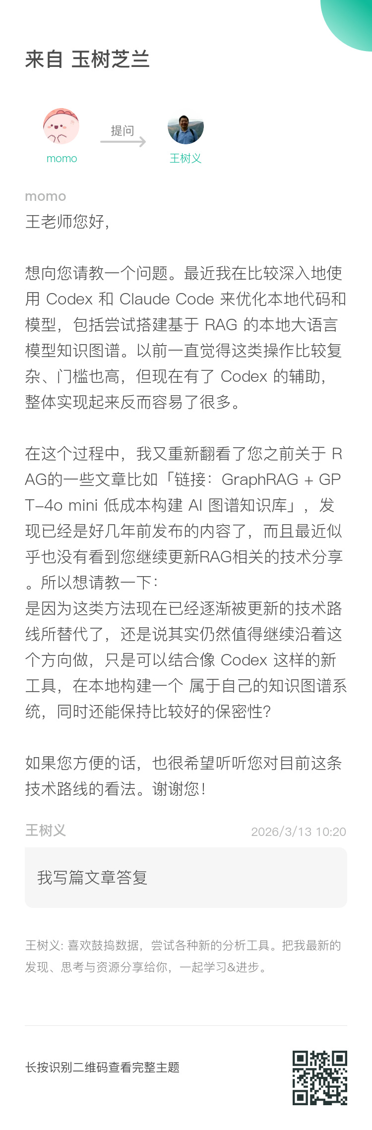 他说自己最近在用 Codex 和 Claude Code 搭建基于 RAG 的本地知识图谱,做着做着回头翻了翻我之前写的 RAG 相关文章,发现已经是好几年前的东西了。他想问的是:RAG 是不是已经被更新的技术路线替代了?还是说仍然值得继续做,只是可以结合新工具在本地搭一个属于自己的系统?