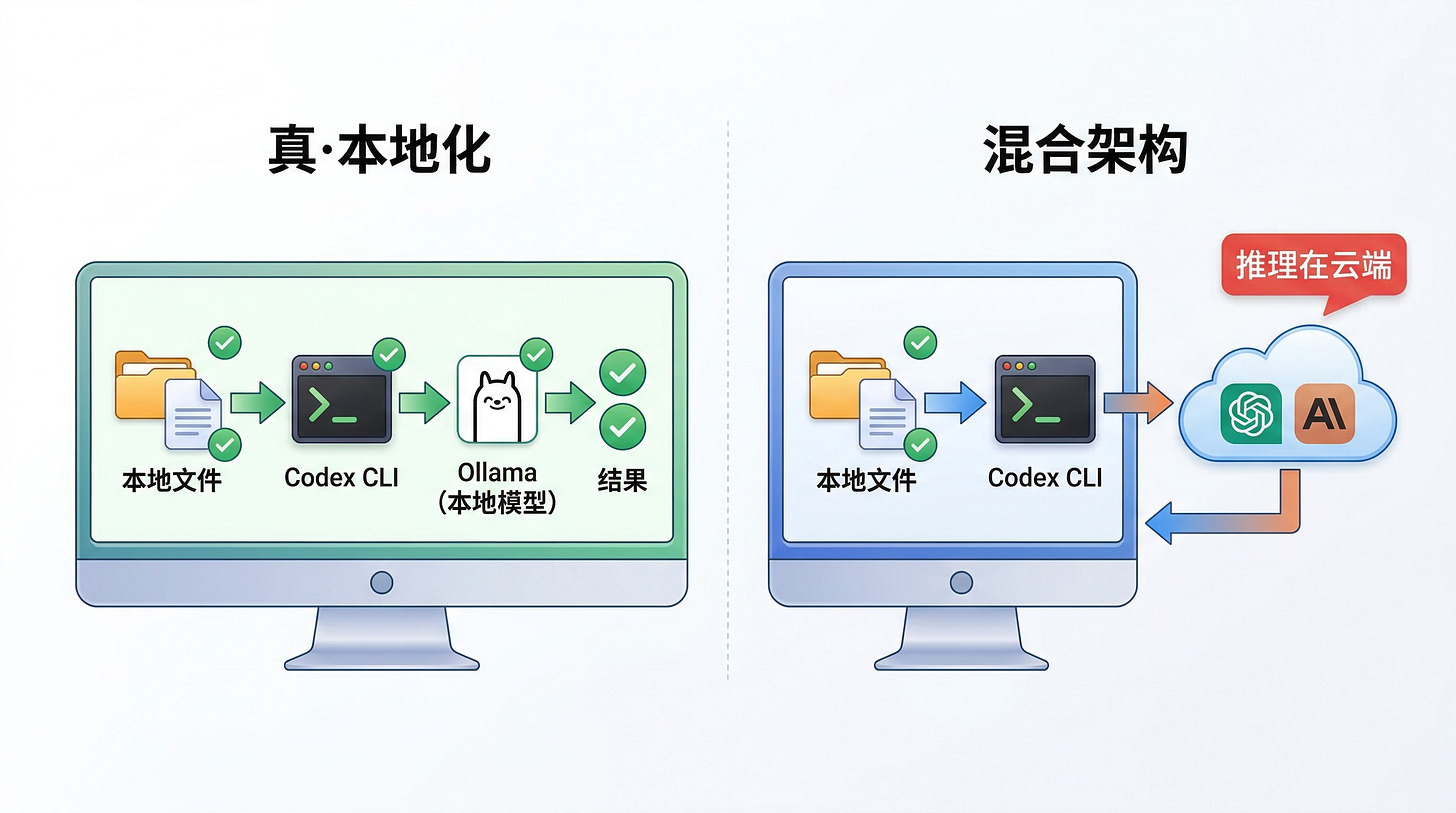 Codex CLI 可以在你本地的目录里读文件、改代码、跑脚本 —— 这些操作确实在你自己的机器上完成。它甚至支持接入 Ollama 之类的本地模型 provider。所以拿 Codex 来做你这套知识系统的工程助手和编排工具,是完全没问题的。