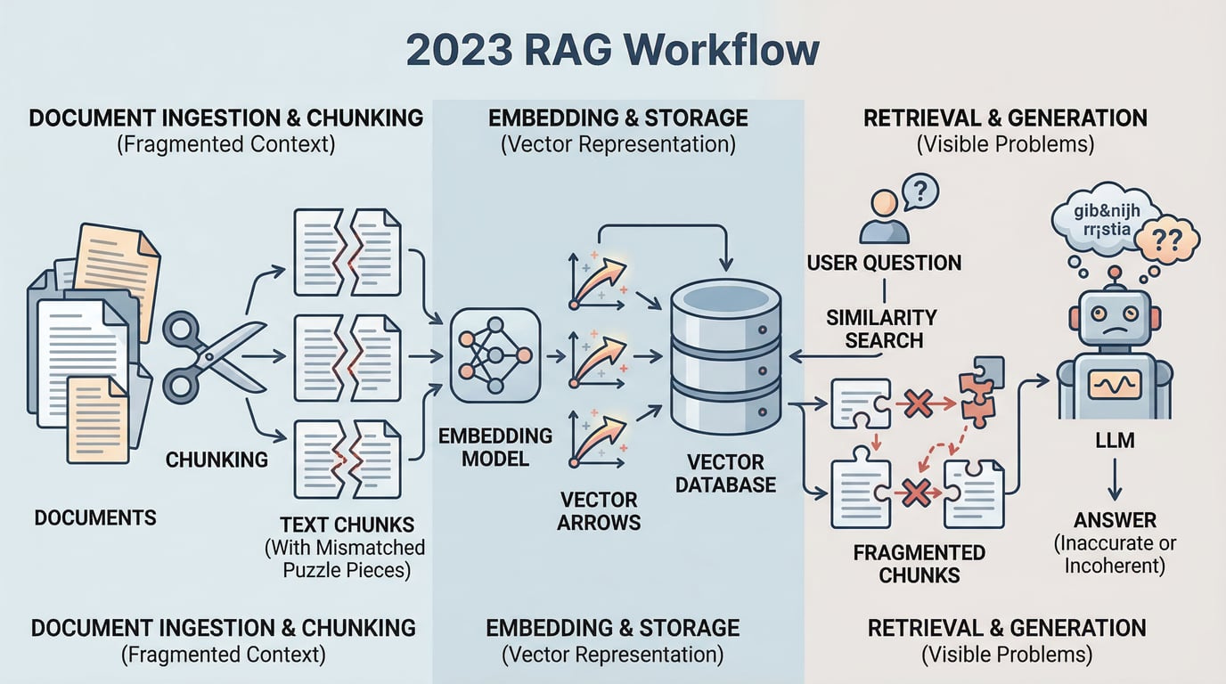你要是还记得 2023 年那阵子的 RAG 教程,基本都长一个样:把文档切成小块,用 embedding 模型转成向量,存进向量数据库,用户一提问就找出最相关的几块拼进 prompt 里喂给大模型。这套流程的好处是简单直接,坏处也很明显 —— 检索质量粗糙,上下文容易断裂,答案经常牛头不对马嘴。