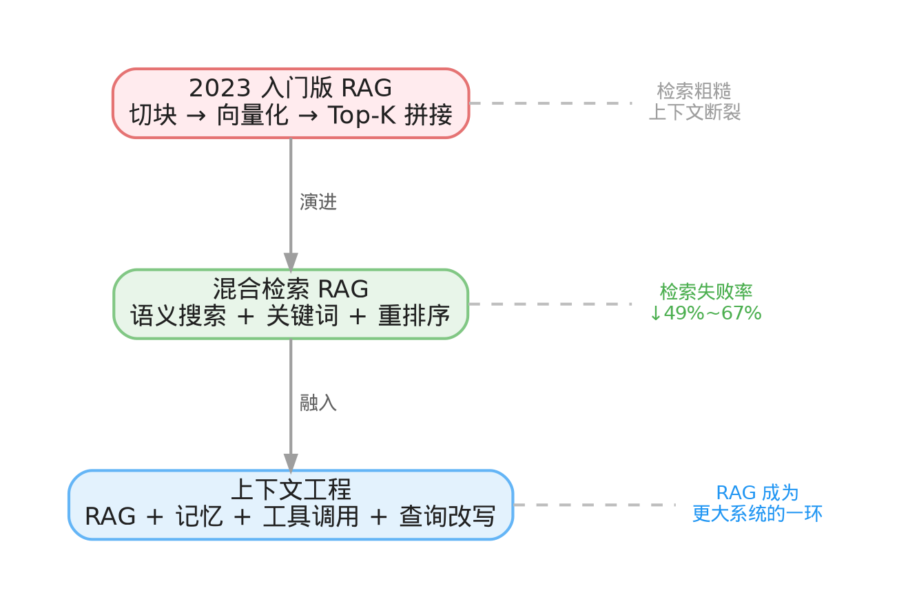 从产品层面看就更明显了。OpenAI 的 API 里到现在还内置着 file search 功能,做的就是语义搜索加关键词的混合检索。Anthropic 在 2024 年推出了 Contextual Retrieval,专门在 RAG 的基础上加了上下文信息和重排序,官方报告混合检索把检索失败率降低了将近一半,叠上重排序之后降了三分之二。这些大厂不是在告别 RAG,它们是在把 RAG 从一个向量库 demo,做成一套工业级的检索工程。