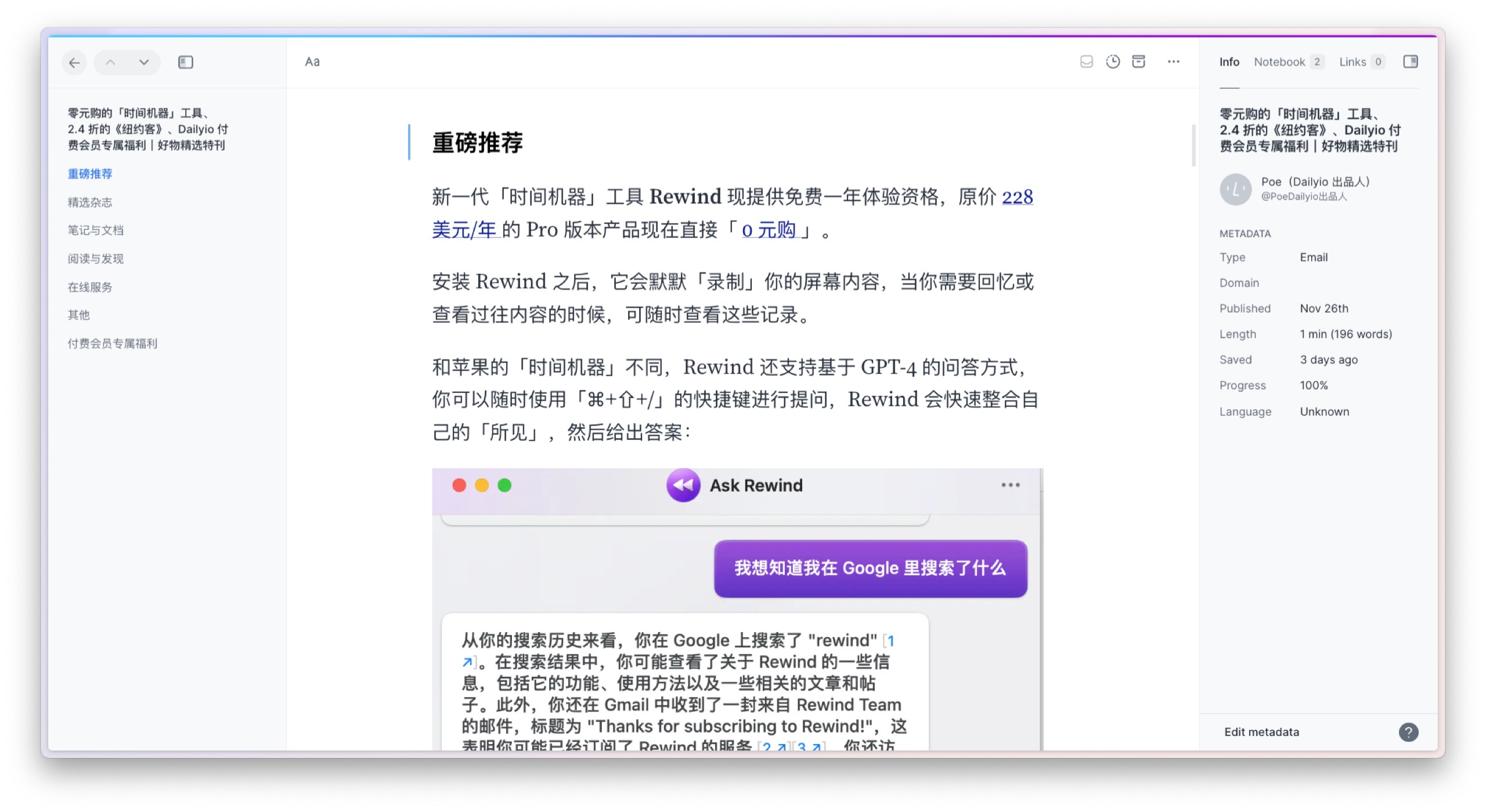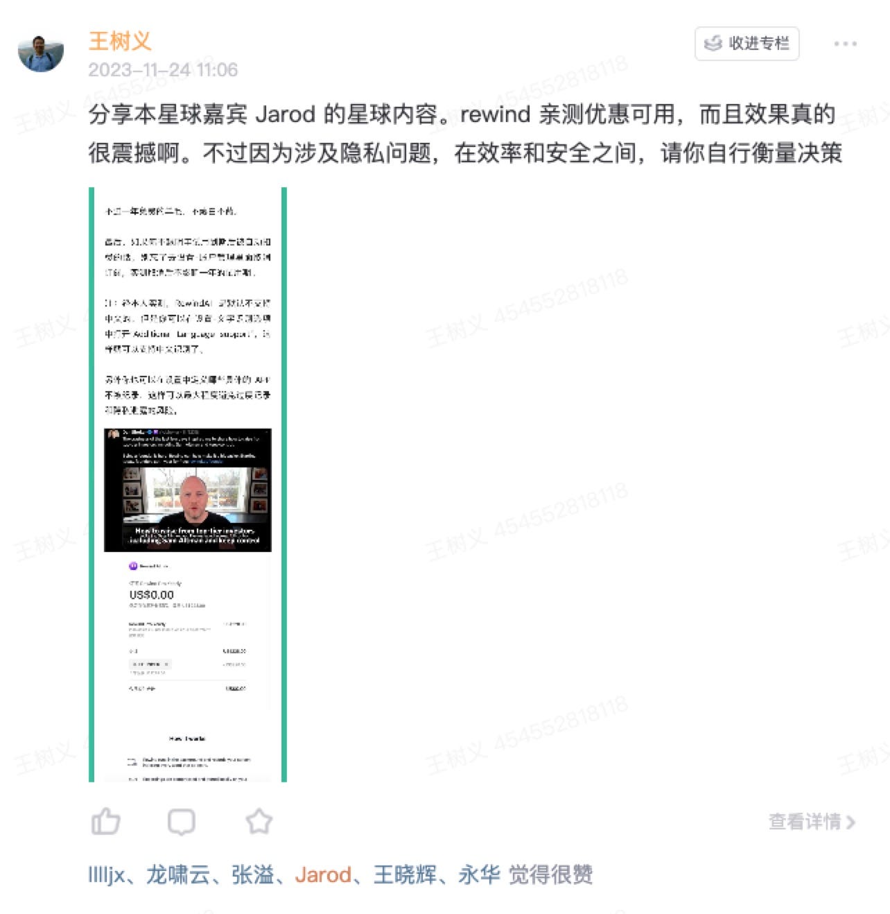 而我的好友数字游民 Jarod ,则更是在知识星球里专文推荐 rewind.ai 。我看后毫不犹豫转发到了自己的星球。