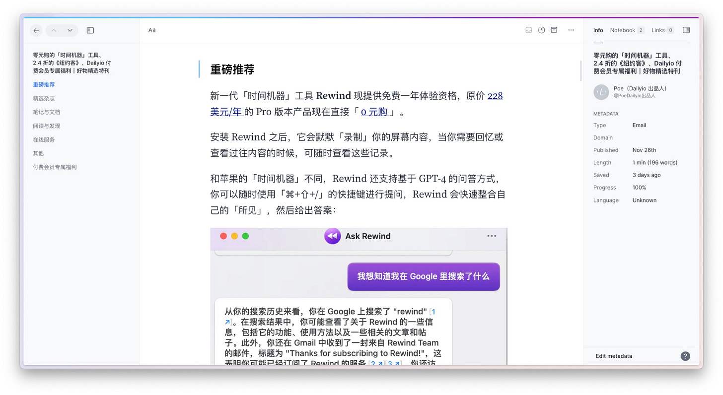 更有甚者,很多给你触动的东西,可能都未曾沉淀在你的笔记系统里。有的时候,我看一篇网文拍案叫绝,往往会拿起 AudioPen 来洋洋洒洒说一段。笔记是留下了,原始出处却忘了记。每次还得凭着蛛丝马迹再来重新查询出处和具体位置,也很低效。