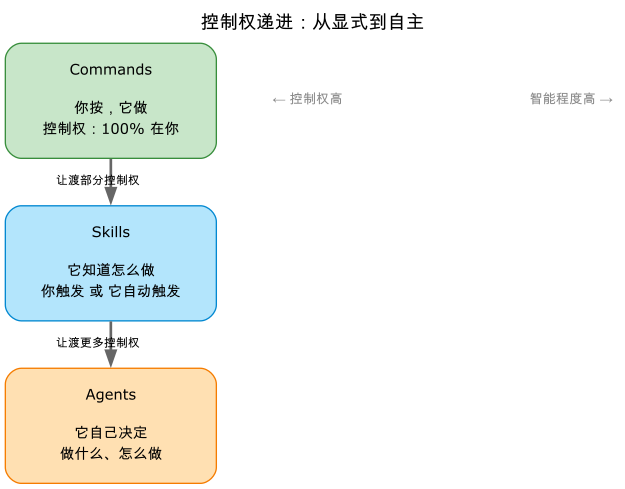 Commands 是「你按按钮」,控制权在你手里。Skills 是「AI 自动识别」,控制权部分让渡给了 AI。