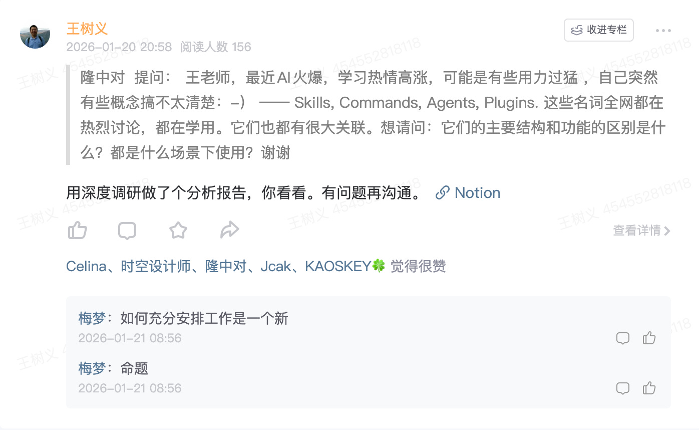 王老师,最近 AI 火爆,学习热情高涨,可能是有些用力过猛 ,自己突然有些概念搞不太清楚:-) —— Skills, Commands, Agents, Plugins. 这些名词全网都在热烈讨论,都在学用。它们也都有很大关联。想请问:它们的主要结构和功能的区别是什么?都是什么场景下使用?谢谢