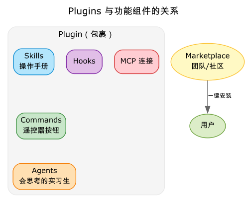 Plugins 是「包裹」,是让你把 Skills、Commands、Agents(以及 Hooks、MCP 连接等)打包在一起、一键分发的机制。