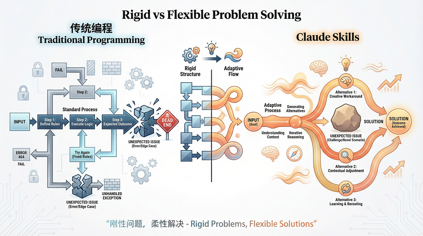 正因为 Agent 这种主动适应能力,Skills 也从一个普通的写满规则、脚本的文件夹,变成了可塑的泥巴,你可以用 Agent 来揉捏它。正如我在星球说的:传统编程是刚性的,而 Skills 搭配 Agent 能「以柔克刚」—— 哪怕初始设计有缺陷,AI 会自己调整策略。