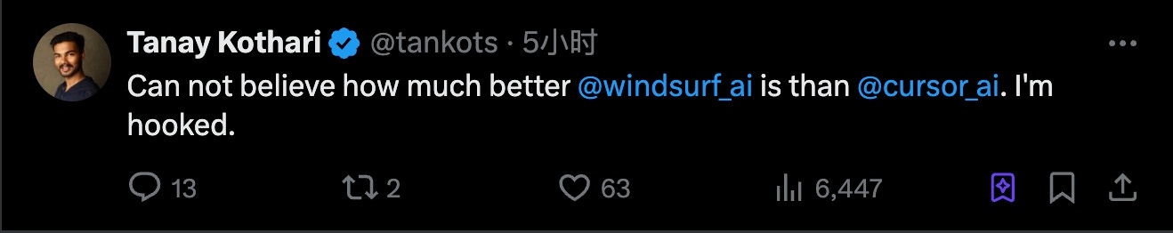难以置信 @windsurf_ai 比 @cursor_ai 好这么多。我彻底被它吸引住了。