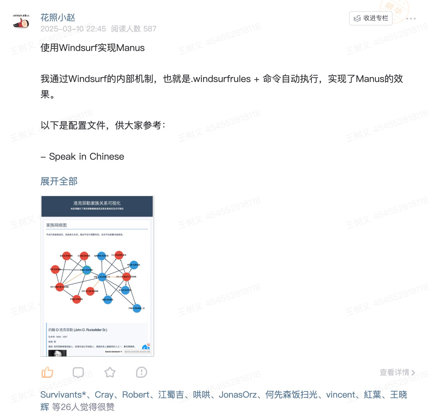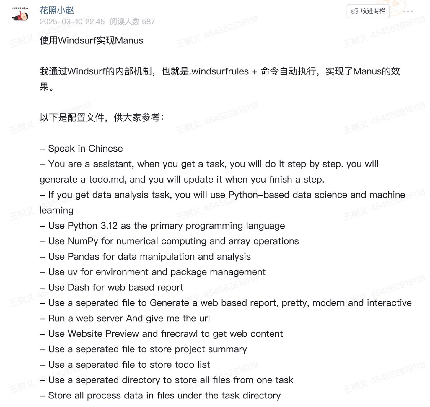 利用 Windsurf 实现自动化的思路,并非纸上谈兵。在知识星球社群里,就有朋友分享了自己的实践经验。例如,星友「花照小赵」就展示了他如何通过设置 Windsurf 规则,让 AI 自动完成深度研究任务。